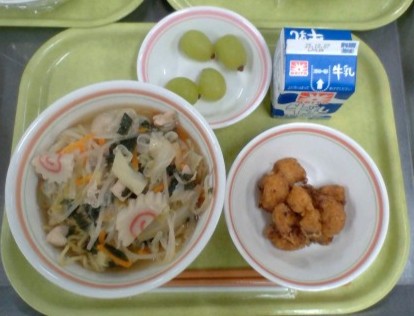 タンメンは肉とたくさんの野菜を炒めて、塩ベースのスープで食べる麺料理です。今日は豚骨、鶏骨、鰹節、昆布、煮干しなど様々なスープを組み合わせてつくりました。いい味のスープになったので子どもたちも喜んで食べてくれていました。