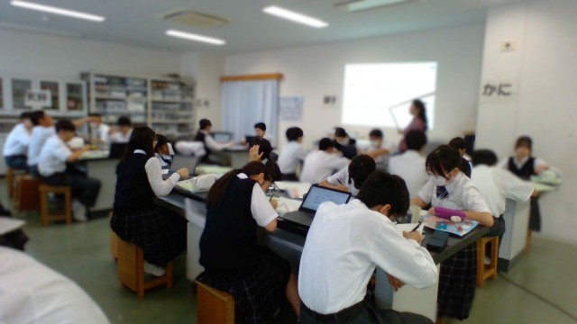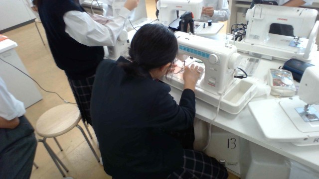 では、タブレットを活用してレポート作成を行っています。家庭科8学年では、ミシンを使って布製ペンケースを作製中です。