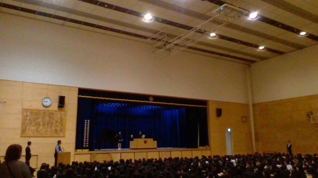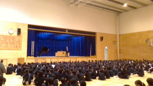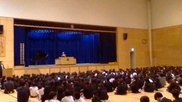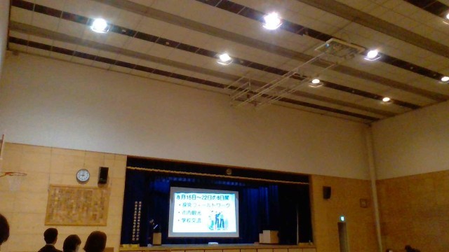 本日、全校児童生徒が集まり、後期始業式が大体育室で行われました。統括校長先生のお話や新生徒会長の話、3名の児童生徒代表の言葉、校歌斉唱が行われました。式終了後には、夏休みに行われたフィンランド派遣研修報告や表彰が行われました。