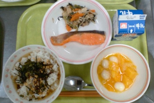 今日はだし茶漬けを作りました。出汁を味わってほしかったので、いつもの汁の時よりも濃い鰹と昆布の出汁をとりました。給食時間中に巡回していると食缶の蓋を開けたときに「良いにおいがする!」などうれしい反応がありました。食べ方も途中で鮭を乗せて味変したりと楽しんでいました。