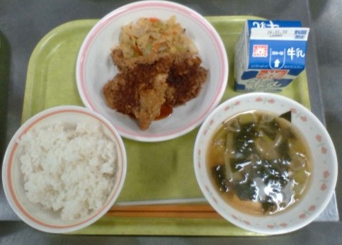 今日は受験で頑張っている9年生と6年生を応援するメニューとして牛カツを作りました。給食では完全に火を通さなくてはいけないので、お店のように柔らかいレア状態ではだせませんが、下味の時にたまねぎのすりおろしとお酒につけてなるべく柔らかくなるように調整しました。揚げてすぐよりは固くなってしまいましたが子どもたちは喜んで食べてくれていたのでよかったです。
