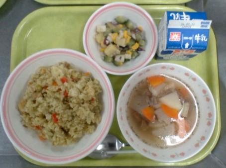 【セビーチェ】・・・生の魚介をレモンなどの果汁で和えたペルー伝統の料理でユネスコ無形文化遺産に登録されています。給  食では生の魚介は使えないので給食用にアレンジしています。