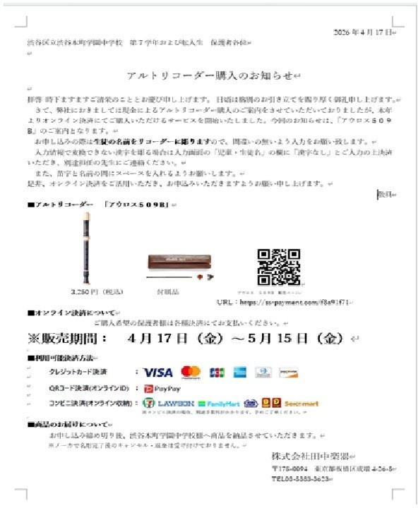 お子さんに「アルトリコーダー購入のお知らせ」(写真)を配布します。ご覧いただき、販売期間内での購入をお願いいたします。