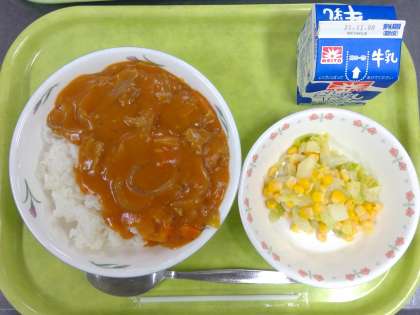 今日は久しぶりのハヤシライス。ルウものはカレーライスが続いていたので、新鮮な感じがしますね。トマトの酸味や赤ワインのコクが玉ねぎの甘さと合わさると、まろやかになります。カレーほどではありませんが、ハヤシライスも大人気!今日は空っぽの食缶が多そうです♪