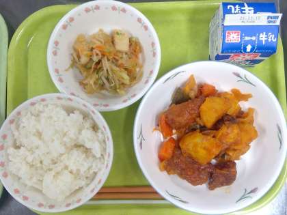 豚肉がゴロゴロ入った酢豚は、具材も大きく、食べ応えがありました。本町学園の酢豚には、素揚げしたじゃがいもも入れています。ほくほくとして、甘酢とも良く合います。