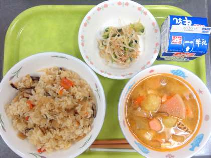 石狩汁は、鮭が入ったみそ汁です。鮭の旨味が赤いエキスとして浮くのですが、低学年はそれがラー油に見えたようです。「辛いスープなの?」と心配そうにしていましたが、一口食べてからニッコリ笑顔で食べていました!仕上げに入れたバターが、良い風味で、鮭と良く合い、美味しかったです。
