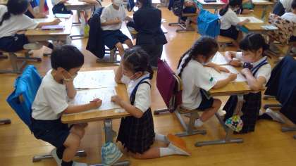 2年生は、「学校ガイドメモ」や各教室の案内をする「案内掲示板」を作成して準備をしました。案内板にはクイズもあったので楽しみながら探検をすることができました。終わった後は、どこを回ったか校内地図を使って振り返りました。2年生が教えてくれるので安心です。自己紹介カードも作成して交換したので、今後さらにかかわりを深めていけるといいと思います。