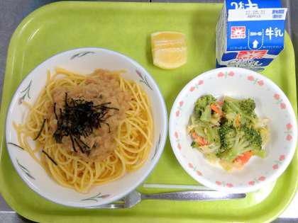 給食のスパゲッティといえば、ミートソースやクリーム系が多いですが、今日はツナと大根おろしであっさりさっぱりの和風でした。学校給食は基本的に加熱して提供となるので、大根おろしの辛味もなく、とても美味しくいただきました!気温が高い日は、あっさりしたものがより美味しく感じますね。