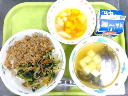 ですが、本町学園では、肉そぼろも野菜のナムルもトッピング方式で、各クラスで配膳をします。盛り付ける品が多ければ多いほど、ちょうど良く配膳するのも、素早く配膳するのも難しくなります。ですが、今日はどのクラスも給食当番さんが本当によく頑張っていました。みんなのおかげで、美味しく食べることができたね!