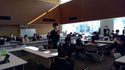 毎年行われる生徒会交流会が、本年度は区役所14階の大集会室で行われました。区役所の方や教育委員の方々、各校の校長先生にも見ていただき、本校の生徒会メンバーは立派に活動報告を行いました。参加した学校の中で唯一の動画を交えた発表で、拍手をもらいながら、楽しい発表ができました。小中一貫校という特色を活かし、これまで取り組んできたことの成果を感じ、また他校の取組から、今後の活動へのヒントをたくさんもらいました。後半は他校の生徒会メンバーとグループになって、未来の学校について話し合いました。お湯と水が出る水道が欲しい、海外とオンラインでつないで授業をしたい、いろいろな分野の専門家から学びたい、下級生に教えに行きたいなど、柔軟な発想で多くの意見が出ていました。これからの活動に活かしていきたいですね。