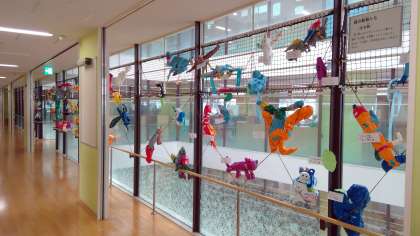 校内の3階廊下に児童作品「森の動物たち」を展示しています。森での生活を楽しんだり日常を過ごしたりする動物を考えました。針金の特徴を生かして、ぶら下がったり羽ばたいたりして動くことができるよう工夫しました。