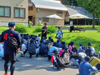 注意点を先生から説明してもらっています。クラス毎に写真を撮って、今から出発します。