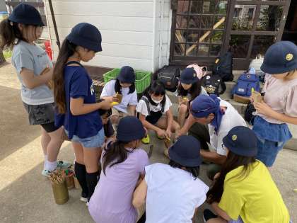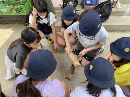 箸作り体験が始まりました。竹を自分たちで割り、小刀で削って細くしていきます。安全に気を付けながらつくっています。箸が完成するのか楽しみです!
