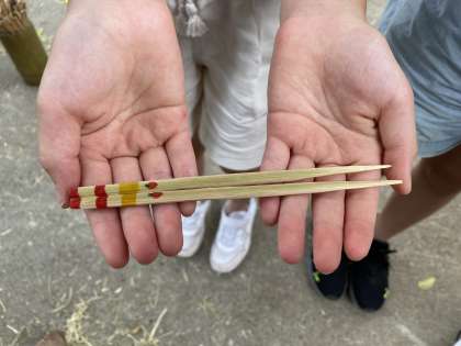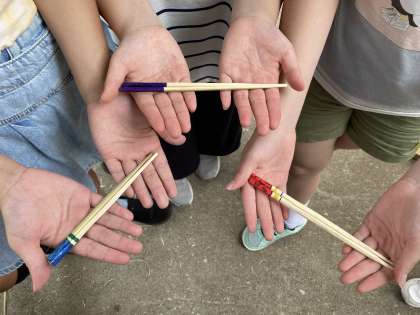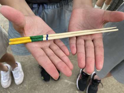 カヌー体験から戻り、箸作り体験の続きをしています。黙々と削ってやすりをかけ、オリジナル箸の完成です。出来上がった箸に色塗りをし、素敵な箸になりました。「今日の夜ご飯から使いたい!」と話していました。