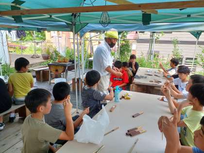 竹をナイフで削って、民宿の方に仕上げてもらいました。箸の使い方を指導してもらっています。ご家庭でも話題にしてみてください。