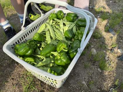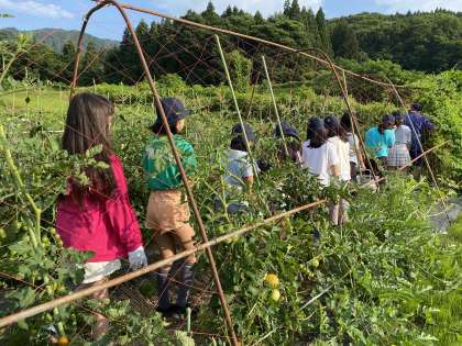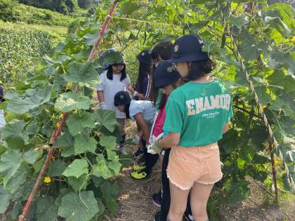 おはようございます。昨日も子供たちはぐっすりと眠り、朝から元気いっぱいです!3日目は、野菜収穫体験からスタートです。きゅうり・モロッコいんげん・ピーマンを収穫しました。宿に戻ってきて、野菜を見ながら「どうやって食べよう?」「ピーマンの肉詰めできるかな?」などとわくわくしていました!