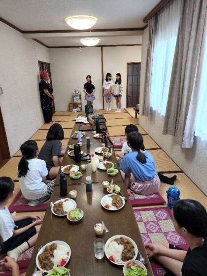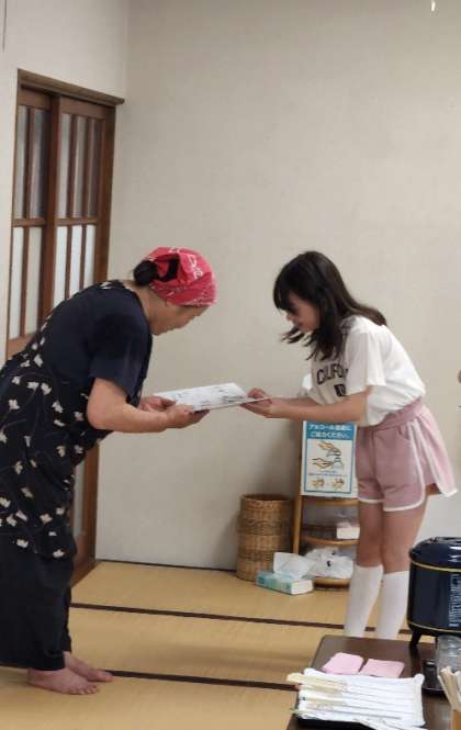 3日間あっという間に過ぎ、お別れのときが近づいています。昼食を食べる前に、実行委員や班長さんが中心となってお別れ会を開きました。私たちのことを常に気遣ってお世話してくださり、たくさんの思い出ができたのは宿の方のおかげです。みんなでお礼を言って、感謝の気持ちを書いた色紙を渡すことができました。