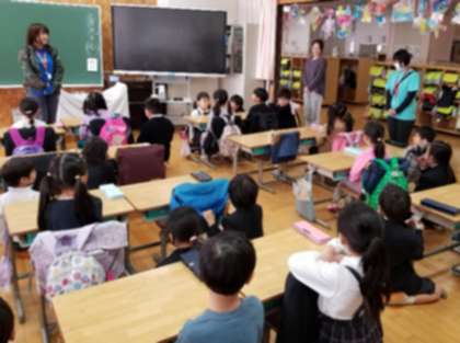 今回は、1年生がお手本を見せて、真似をしてもらうことで、小学校の活動を体験してもらいました。