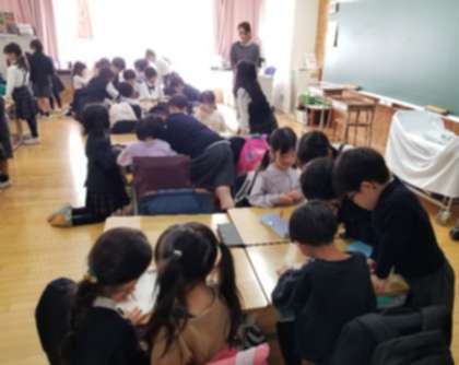 他には、自分の名前を書いたり、普段使っている道具箱の中身や教科書を紹介したり、あやとりで一緒に遊んだりしました。連携園のお友達に少しでも小学校の生活を楽しみにしてもらえるように、優しく話しかける1年生の姿がたくさん見られ、担任としても嬉しく思いました。
