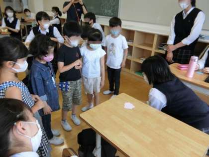 理科室では、ミジンコの様子や理科の実験に使う道具などを見せてもらいました。理科専科の先生が「ミジンコに心臓があるのが分かるかな」と質問すると、「ほんとだ!動いてる!」と興味津々に話を聞いていました。「質問がある人!」と聞くと、「水道の水にも生き物がいるんですか」「昆虫の骨はどこにあるのですか」など、鋭い質問がどんどん出て、見ている側も、感心してしまいました。