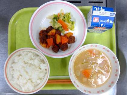 日本では昔から、くじらを獲って食べる習慣がありました。特に昭和30年から40年代にかけて、安くて栄養のあるくじらは学校給食によく登場しました。今日の献立ではくじらをケチャップベースの甘いタレで味付けた、オーロラ煮にして出しました!くじら肉はしょうがの下味で臭みも消えて、美味しく食べられました。