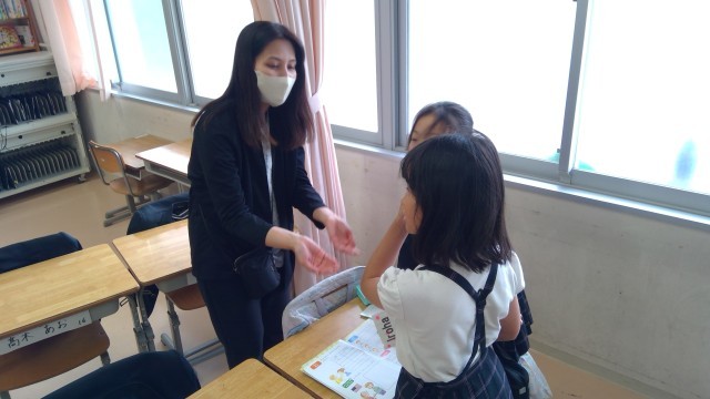 「Hello! I'm~. Do you like ~?」という会話表現を使って、友達や先生と好きなものを伝え合う姿が見られました。
