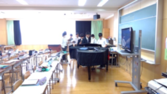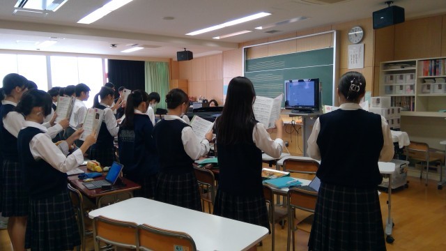 9年音楽科の授業では、7月に開催される音楽フェスタに向けた合唱練習等を行いました。授業前半では唱歌「花」を全員で歌唱し、後半は、