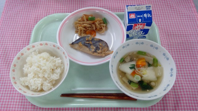 【献立】ごはん、牛乳、鰆の麦みそ焼き、冬瓜のスープ、切干大根の炒め煮