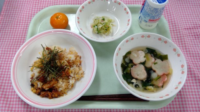 【献立】ひつまぶし、牛乳、すまし汁、キャベツとみょうがのうめあえ、くだもの(冷凍みかん) ※写真は低学年の分量です。