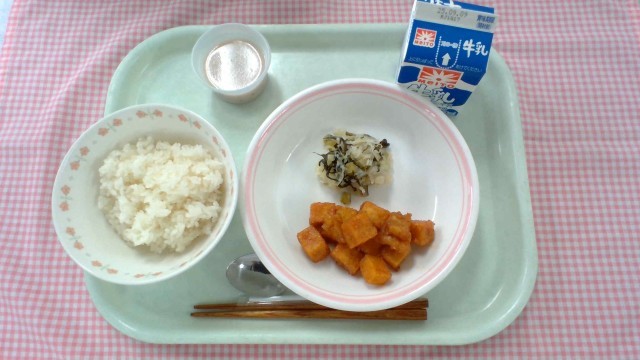 【献立】ごはん、牛乳、凍り豆腐のチリソース、野沢菜あえ、いちごミルクゼリー     ※写真は低学年の分量です。