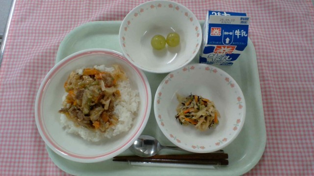 焼肉丼の具は、牛肉とキャベツやにんじん、ピーマンなどたっぷりの野菜を炒めてみそやコチュジャン、砂糖などで味付けをしています。3時間目から楽しみにしていた児童もいたようで、子供たちはおかわりをして、どのクラスもよく食べていました。ピーマンが苦手な1年生も「嫌いだけど頑張って食べた」「あまり苦くなかった」と、完食したお皿を見せてくれました。瀬戸ジャイアンツは、シャインマスカットと同じく皮が緑色の甘いぶどうで、粒の形が桃に似ていることから「桃太郎ぶどう」とも呼ばれるそうです。