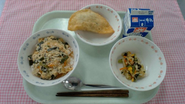 【献立】たまごとキムチのクッパ、牛乳、チョレギサラダ、ツナ揚げぎょうざ