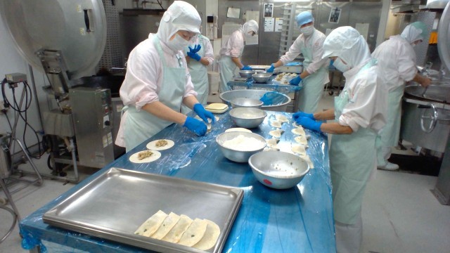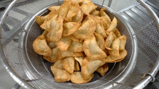 今日の揚げぎょうざは、豚ひき肉のかわりにツナを使って作りました。一般的なぎょうざと同じように、キャベツとニラも入れて作るので、ぎょうざの風味でおいしく食べられます。給食ならではの大きなぎょうざの皮で1つ1つ丁寧に包んで、きつね色になるようにカリッと揚げました。かなり大きいのですが、どの学年もほぼ残ることなくよく食べてくれていました。