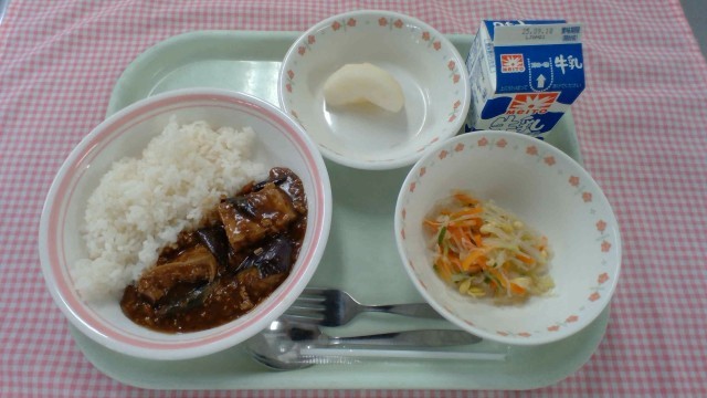 【献立】マーボーナス丼、牛乳、中華酢あえ、くだもの(梨) ※写真は低学年の分量です。