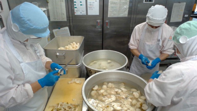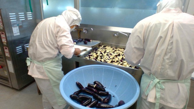 マーボーナス丼は、ナスを乱切りにして素揚げして生揚げと一緒に肉みそと混ぜ合わせました。ナスは油と相性がよく、素揚げすると色よく、やわらかい食感に仕上がります。苦手な人も多いのですが、「食べられた!」「意外とおいしかった!」と言って、食べてくれていました。少しずつ苦手な食べ物も食べられるようになっているようです。くだものは今年初の梨が登場です。一つ一つ皮をむき、芯を取って、色が変わらないように塩水をくぐらせています。まだまだ蒸し暑い日が続きますが、くだものは秋にかわってきています。