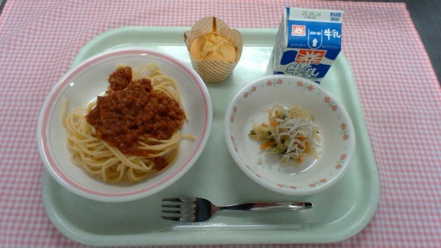 【献立】スパゲティミートソース、牛乳、じゃこサラダ、マフィン     ※写真は低学年の分量です。