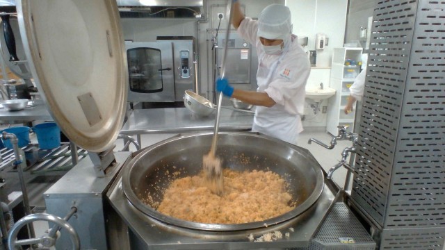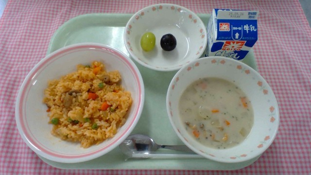 【献立】チキンライス、牛乳、クラムチャウダー、くだもの(ぶどう食べ比べ)     ※写真は低学年の分量です。