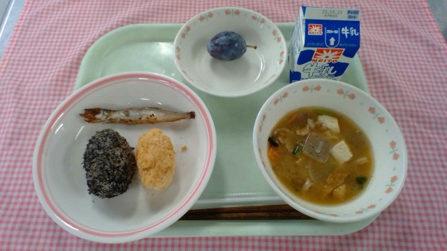 【献立】おはぎ(きなこ・黒ゴマ)、牛乳、豚汁、ししゃものピリ辛焼き、くだもの(プルーン) ※写真は低学年の分量です。