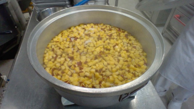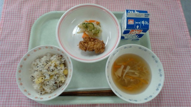 秋になり、これからおいしいのが「さつまいも」です。今日はシルクスイートというしっとりとした食感のさつまいもをごはんに入れて炊き込みました。炊き上がりには、ふんわりとさつまいもの甘い香りが給食室に広がります。山賊焼きは、長野県松本市で食べられている料理で、ニンニクじょうゆで下味をつけて油で揚げています。子供たちは給食が届くと「いいにおいがする!」と言って蓋を開き、「からあげだ!」と喜んでいました。やっぱりからあげはどのクラスも大人気です。あえ物には、みそで作ったドレッシングをかけましたが、野菜が苦手な人も食べやすかったようです。