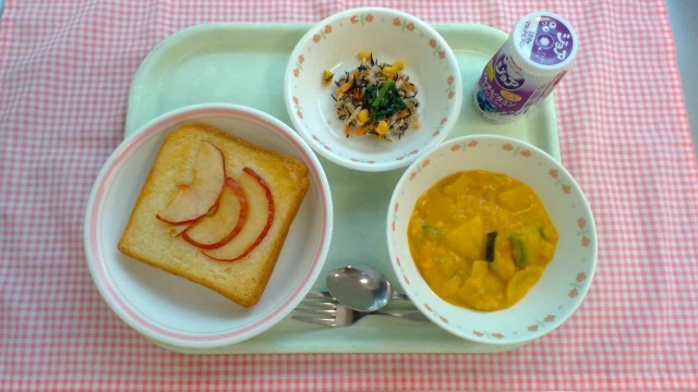 【献立】アップルトースト、飲むヨーグルト(ブルーベリー)、パンプキンシチュー、ひじきとコーンのサラダ