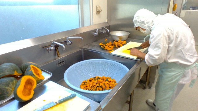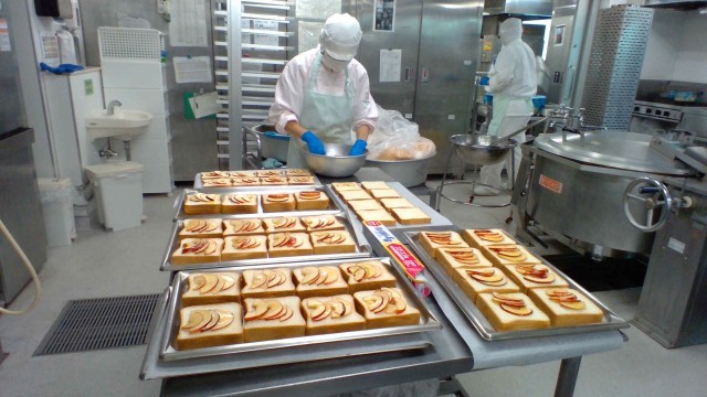 10月10日の『目の愛護デー』にちなみ、目のビタミンとよばれる「ビタミンA」がたっぷり含まれているかぼちゃを使ったシチューを作りました。アップルトーストは、紅玉りんごを包丁で薄切りにして、シナモンシュガーをまぶして食パンに並べ、バターをかけて焼いています。給食室で1枚1枚仕上げるのは数も多く大変なのですが、調理師さんがきれいに仕上げてくれました。子供たちからは、甘じょっぱくておいしい、りんごがすっぱい、耳がカリカリ、などの感想が聞かれました。