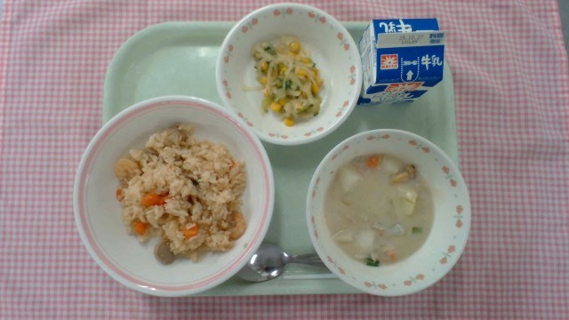 【献立】ジャンバラヤ、牛乳、クラムチャウダー、大根とコーンのサラダ ※写真は低学年の分量です。