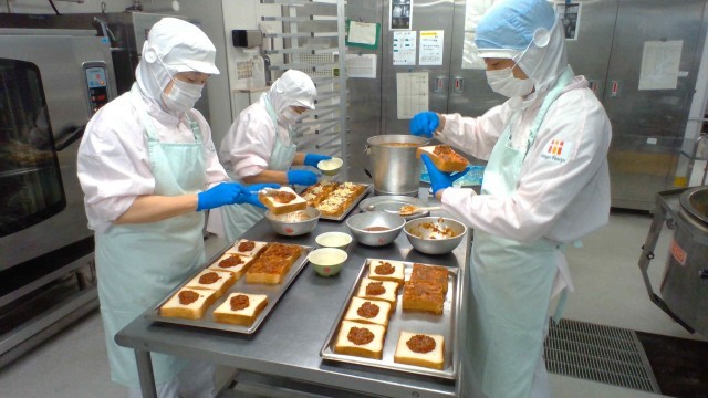 ピザトーストに塗ったピザソースは、にんにく、たまねぎ、ピーマンをオリーブオイルで炒め、トマトピューレとトマトケチャップを加えて混ぜながらよく煮詰めたら、ハムと香りづけのバジルを加えて作っています。調理師さんは1枚ずつ、食パンの端までピザソースを丁寧に塗ってくれました。手作りのピザソースとチーズがこんがりと焼けて、子供たちもおいしいとよく食べていました。人気のメニューはよくレシピが知りたい!と声がかかります。ぜひ家でも作ってみてくださいね。