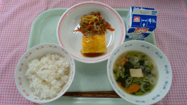 【献立】ごはん、牛乳、枝豆入り卵焼き、吉野汁、揚げじゃがいもの金平 ※写真は低学年の分量です。