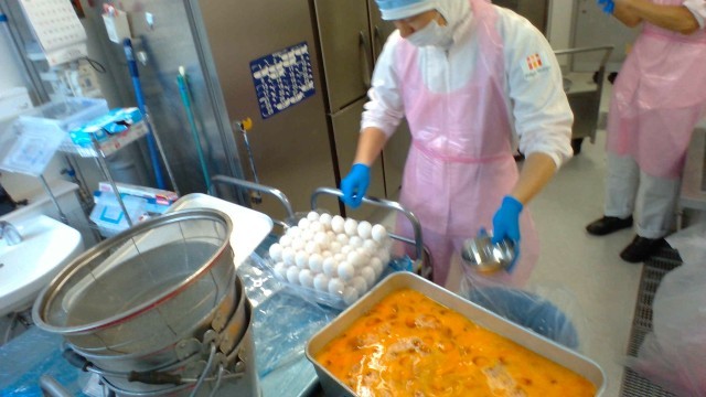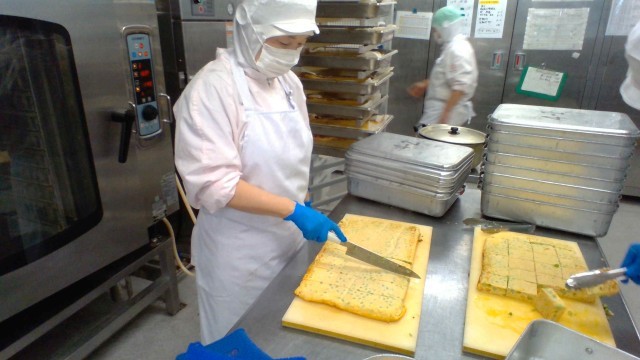 給食で卵焼きを作る時には、全校分で約30㎏、600個ほどの卵を使います。調理師さんは片手で手際よく卵を割っていきます。炒めた具と混ぜ合わせて、天板に流し入れたらオーブンでじっくりと焼きます。焼きあがったら1人分に切り分けて、クラスごとに分けて入れ、あんをかけたら完成です。朝からいくつもの作業があって、ようやく580人分の卵焼きが完成します。子供たちにおいしく食べてもらえるように、一つ一つ丁寧に作っています。