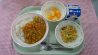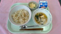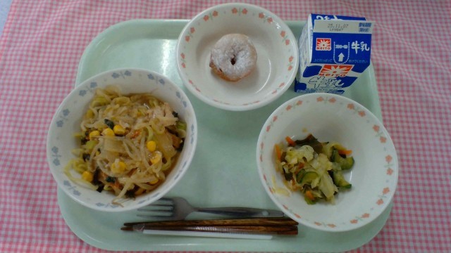 【献立】みそラーメン、牛乳、わかめサラダ、もちもちかぼちゃドーナッツ ※写真は低学年の分量です。