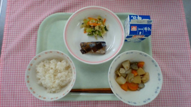 【献立】ごはん、牛乳、秋刀魚の松前煮、炒り鶏、野菜の梅肉あえ ※写真は低学年の分量です。