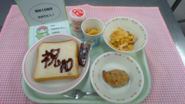 今日は、代々木山谷小学校開校10周年記念の「こども祭り」に合わせて、10周年を祝う特別献立です。給食委員が考えて選んだ3つの献立から、全校生徒の投票で決定しました。みんなが大好きなパリパリサラダやチキン、特別感を演出する紙コップに入れたフライドポテトも登場です。子供たちからは「毎日この給食が食べたい!」といわれるくらい大人気で、どのクラスでもおいしそうに食べていました。食パンには、チョコソースで文字やイラストが描けるようになっていますが、10周年の「10」や「祝」、代々木山谷小学校の10周年キャラクター「よよまるくん」を描いたりして楽しんでいました。