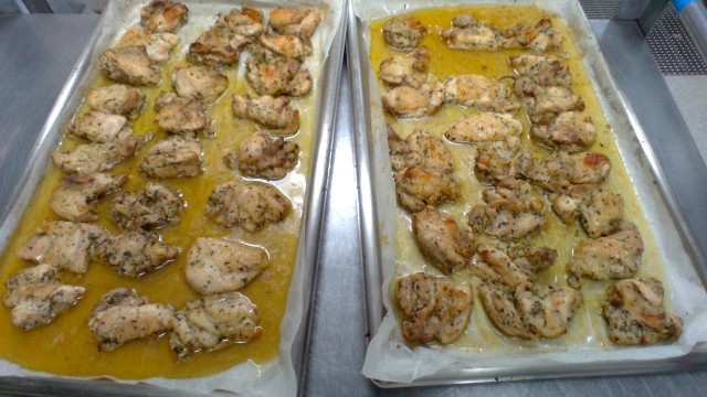 【献立】国産小麦食パン&チョコソース、飲むヨーグルト、ハーブチキン、カップ入りフライドポテト、パリパリサラダ      ※写真は低学年の分量です。