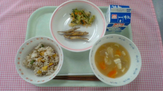 【献立】山坂達者飯、牛乳、きびなごの唐揚げ、豚汁、土佐あえ      ※写真は低学年の分量です。